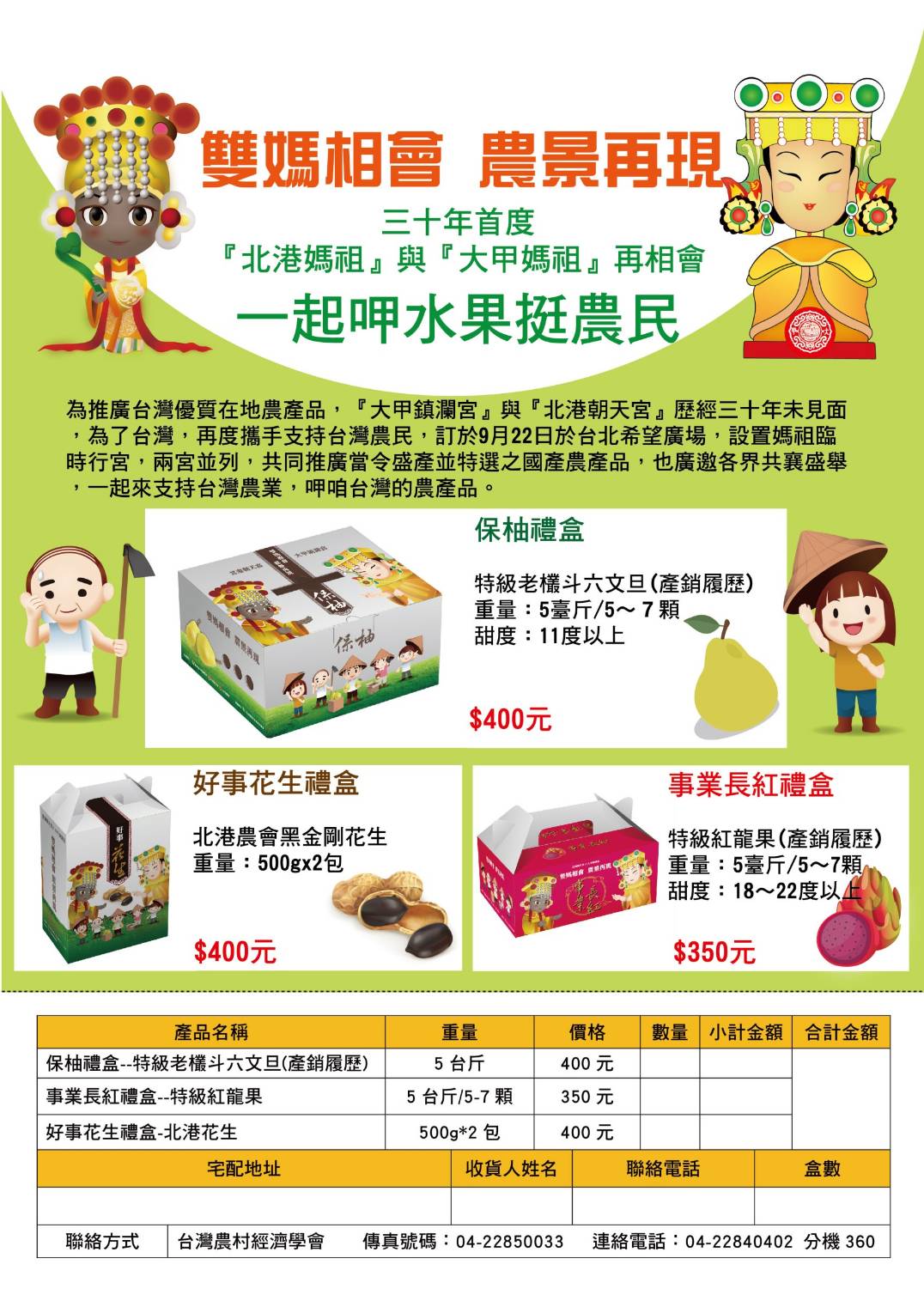 2018.09.22、23双妈相会 台北希望广场逗阵挺农YA~ 2018-09-11 RulingDigital 双妈相会 农景再现 三十年首度 「北港妈祖」与「大甲妈祖」再相会 一起呷水果挺农民 为推广台湾优质在地产品,「大甲镇澜宫」与「北港朝天宫」历经三十年未见面,为了台湾,再度携手支持台湾农民,订于9月22日于台北希望广场,设置妈祖临时行宫,共同推广当令盛产并选之国产农产品,也广邀各界共襄盛举,一起来支持台湾农业,呷咱台湾的农产品。 双妈会海报 双妈订购单